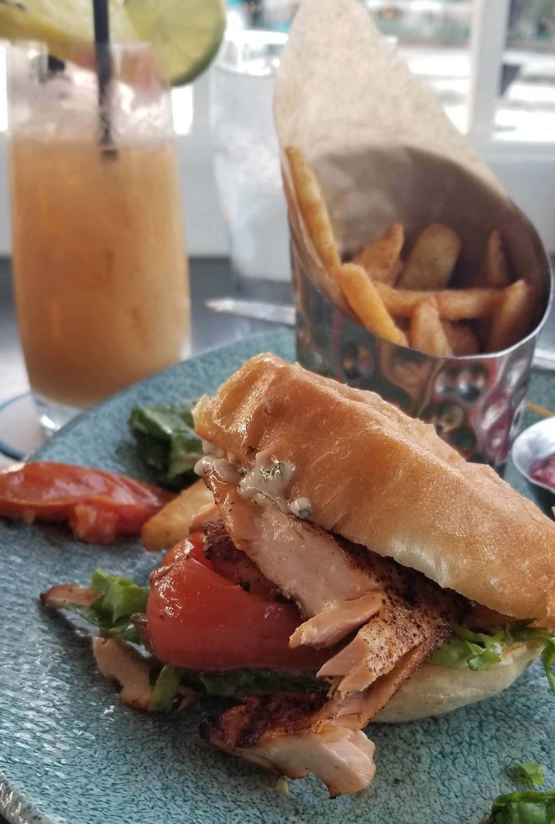 Salmon PLT – Grilled Salmon with crispy Pancetta, Romaine Lettuce, Roasted Plum Tomato, Lemon-Bacon Aïoli, and Toasted Focaccia served with Malted Fries. $23