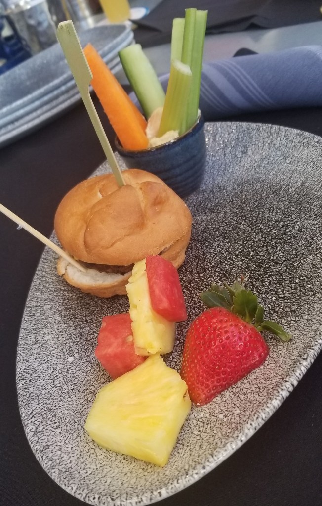 Burger Slider – Mini Burger with Cheese and Pickles served with a flower pot of Veggies with Hummus and fresh Fruit. $10