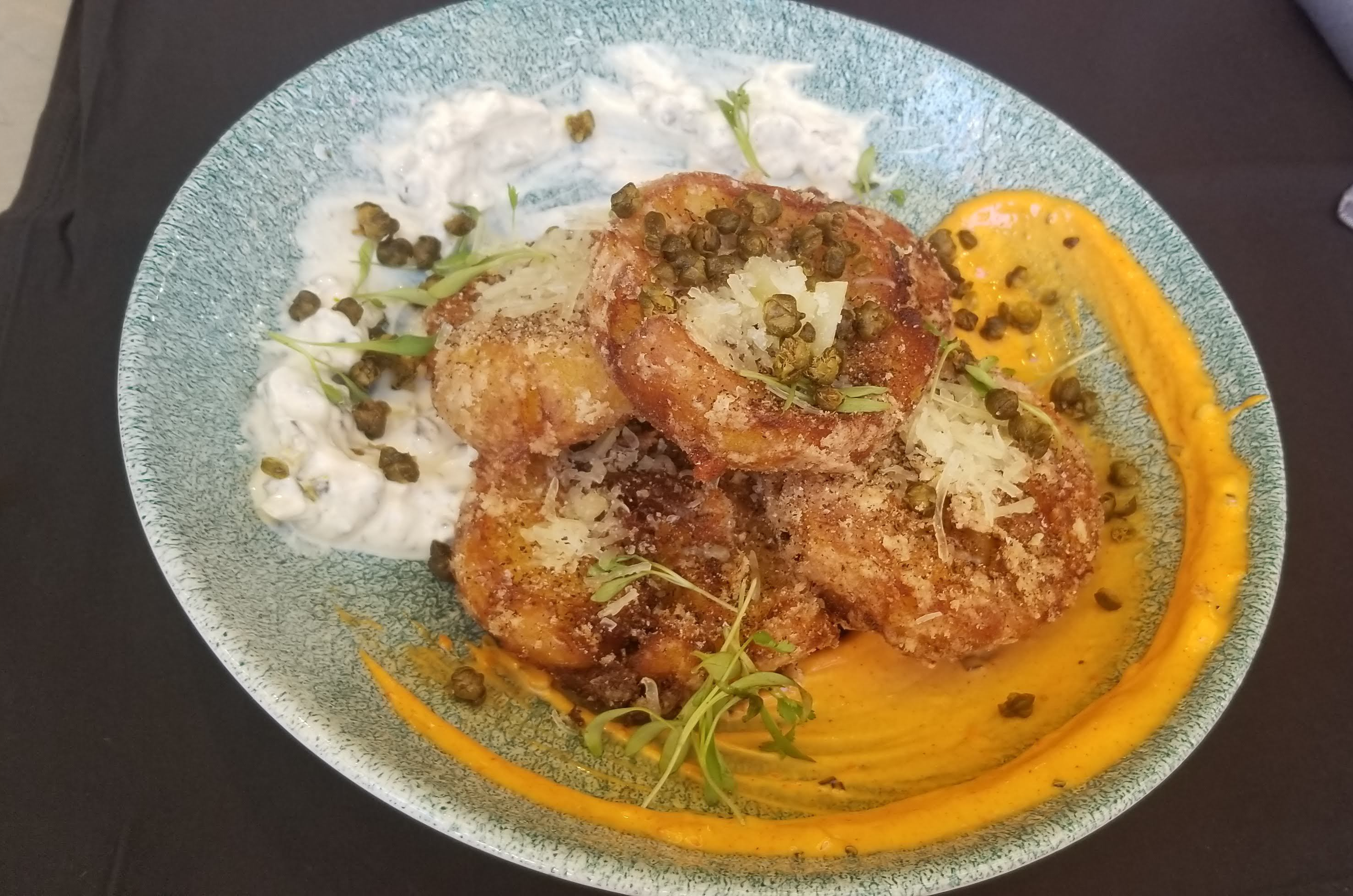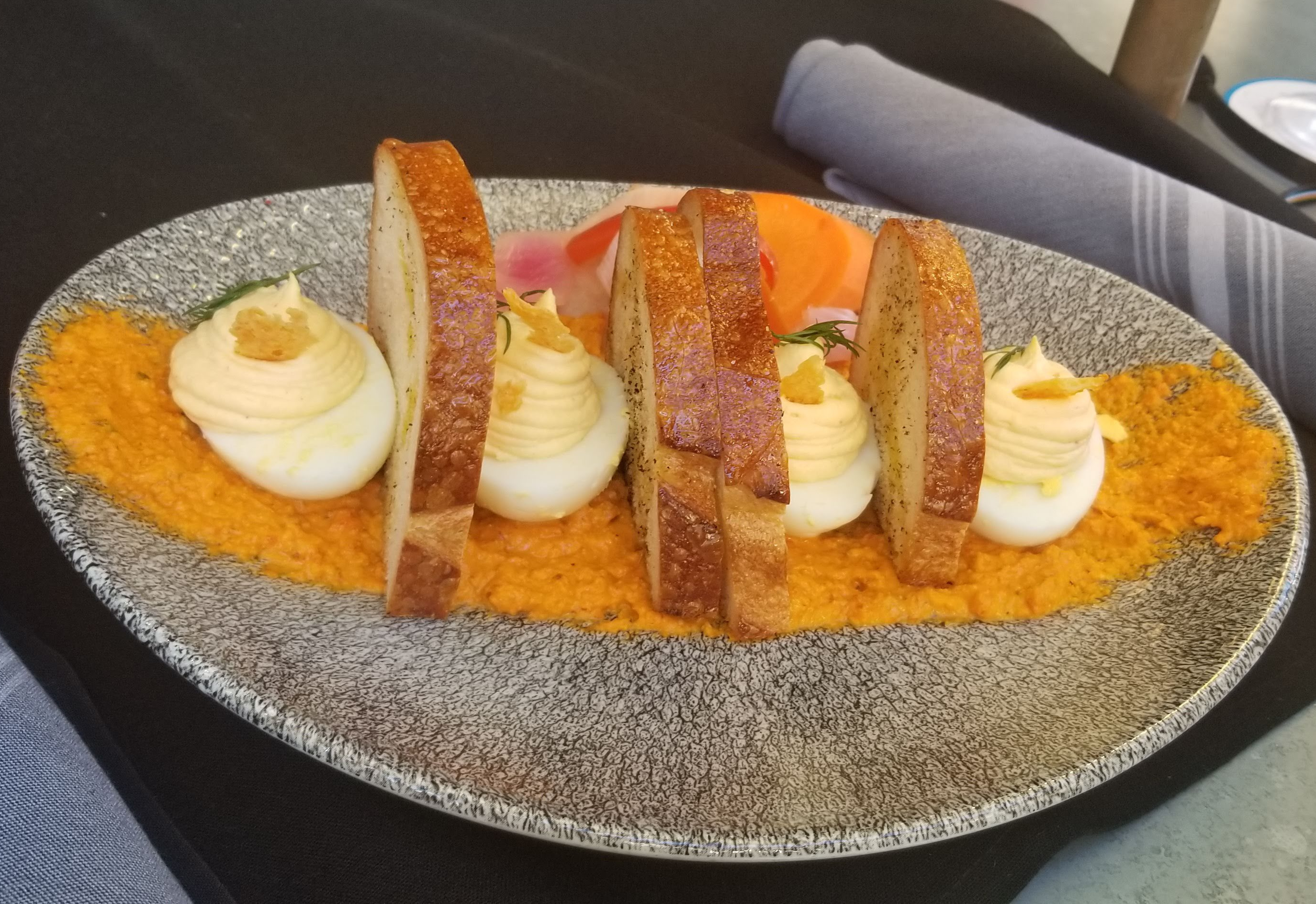 Deviled Eggs and Toast – Creamy Egg Salad, Toasted Almond Romesco Sauce, Dill, Manchego Crisp, and Toast. $12