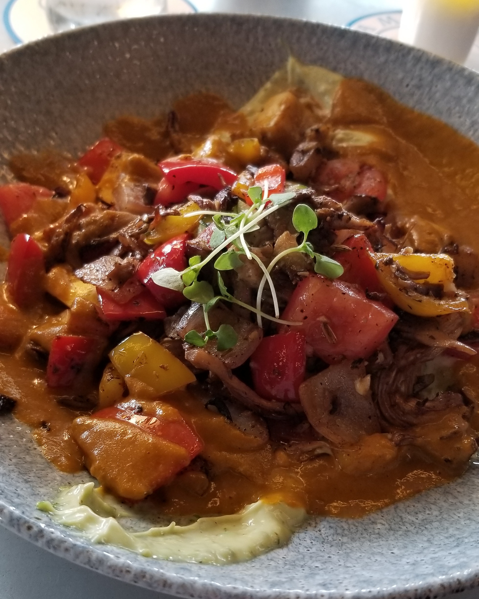 Ratatouille – Roasted Eggplant and Bell Pepper Ragoût with Zucchini Noodles, Burrata Cheese, Mushrooms, Smoked Tomato Sauce, and Basil Aïoli. $19